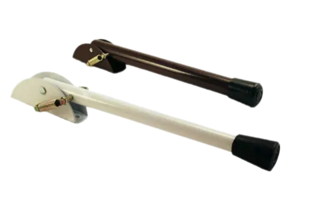 Упор призначений для фіксації стулки дверей у будь-якому положенні.Упор складається з труби з гумовим наконечником типу “копыто”, кронштейна та двох пружин, які фіксують упор у крайніх точках, вся конструкція скріплена заклепками, які забезпечують міцність конструкції. Гумовий наконечник запобігає ковзанню упору по покриття для підлоги, тим самим фіксує стулку в будь-якому положенні, довжина 260 мм.